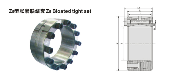 特性: Z5型脹緊套與Z4型比較各錐環錐度相同,且內環中間有凸緣,便于拆卸。Z5型結合面較長,錐度較小,用于傳遞較大載荷和對中精度要求較高的場合。