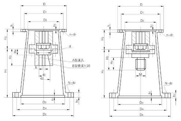 JAI大法蘭機架<69標>、JAII<69標> 機架適用于擺線針輪減速機的聯接,配剛性聯軸器,上聯軸器裝JA型直孔,下聯軸器裝A型直孔或B型錐孔,錐度為1:20的聯軸器。該機架無支承適用于反應器傳來的軸向力不大時使用。