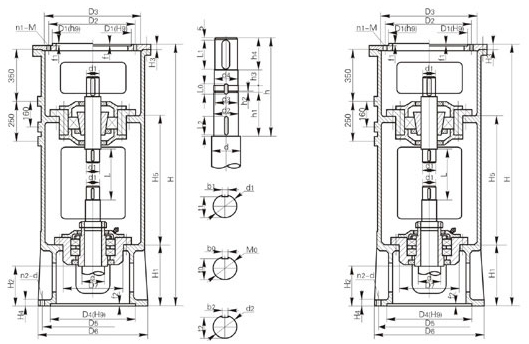 XS型雙支點機架內布置有兩個軸承室,為攪拌軸提供嚴格意義上的兩個支點,用于高速攪拌或對攪拌軸在密封處饒度有嚴格限制的場合。攪拌軸與減速機輸出軸采用柔性聯軸器聯接。