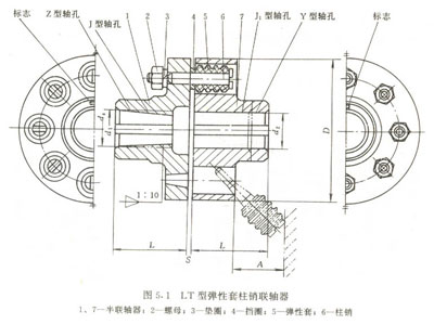 LT型(原TL型)彈性套柱銷聯軸器(GB4323-2002代替GB4323-1984)彈性套柱銷聯軸器是利用一端套有彈性套(橡膠材料)的柱銷,裝在兩半聯軸器凸緣孔中,以實現兩半聯軸器的聯接。彈性套柱銷聯軸器曾經是我國應用最廣泛的聯軸器,早在 20 世紀 50 年代末期即已制訂為機械部標準, JB08-60彈性圈柱銷聯軸器,是我國第一個部標準聯軸器。